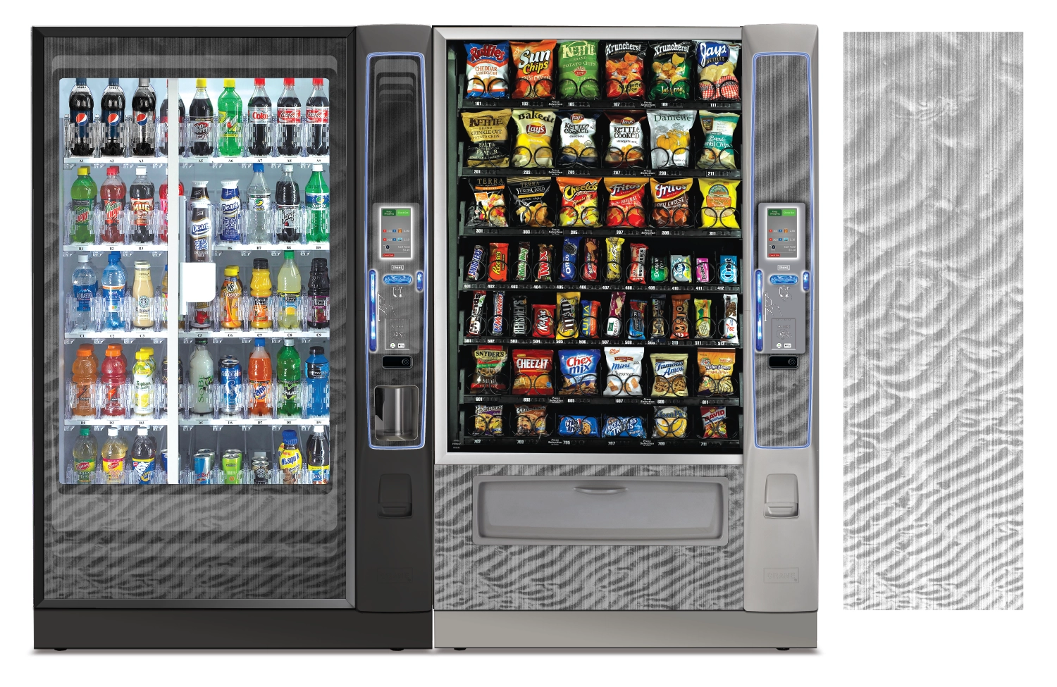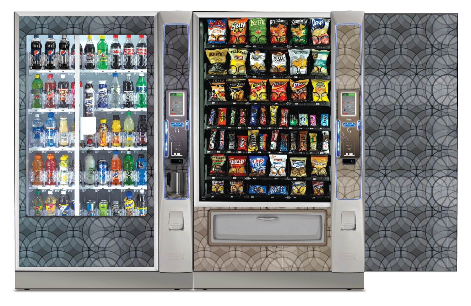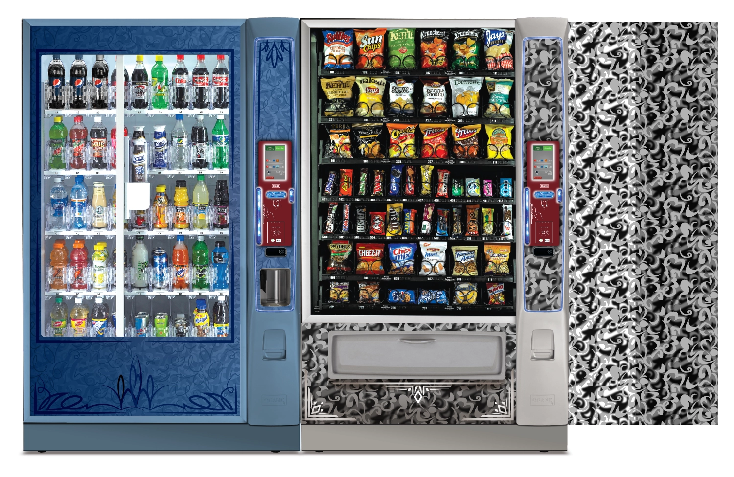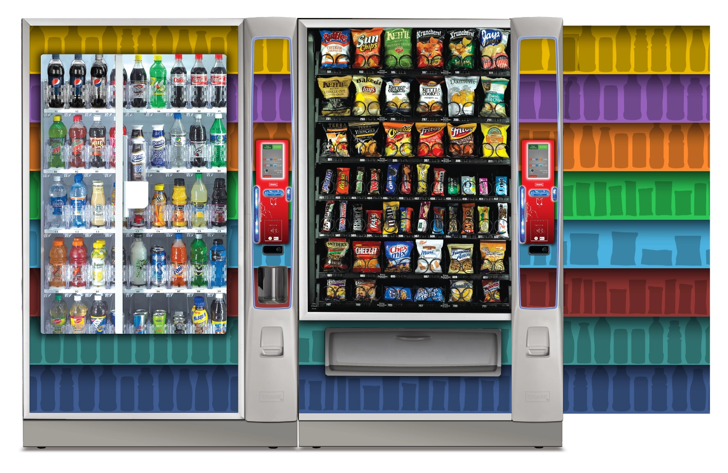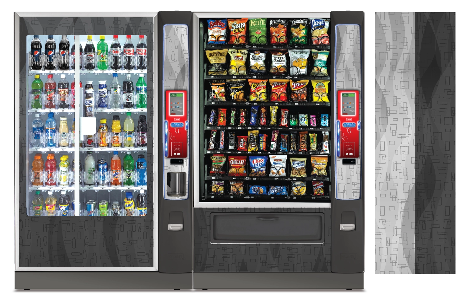 Create a collection of vending machine graphics that suit a spread of location environments and industries as options to choose from when graphics are not provided by the buyer. Implement color, saturation, textures, line, and tones to provide a diversity of visual solutions.
