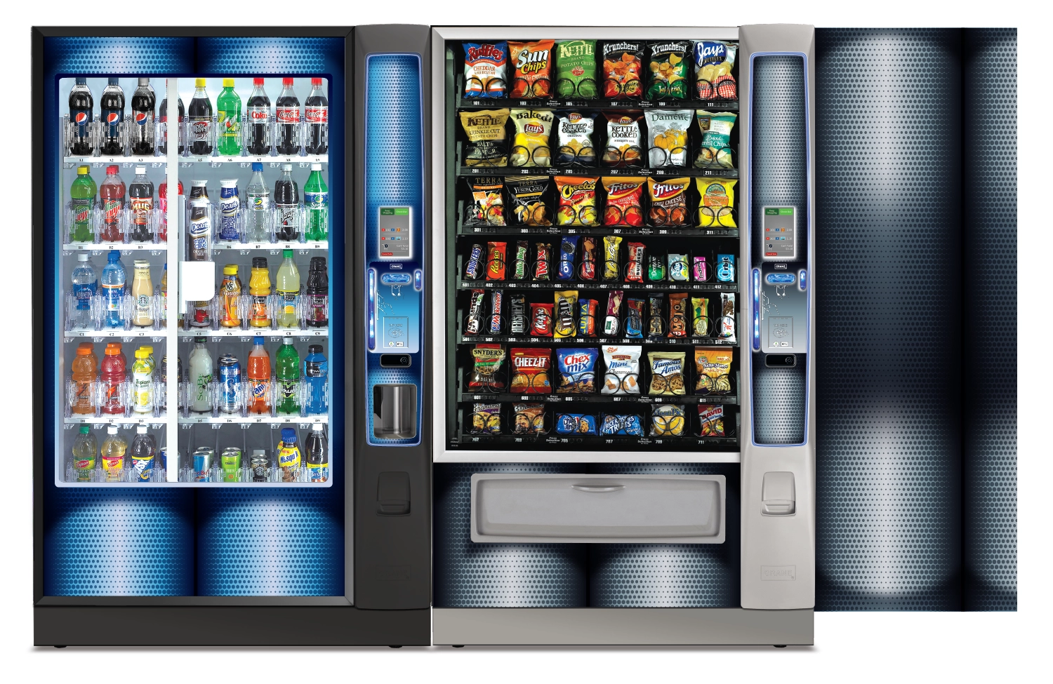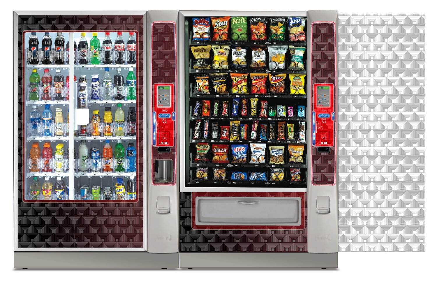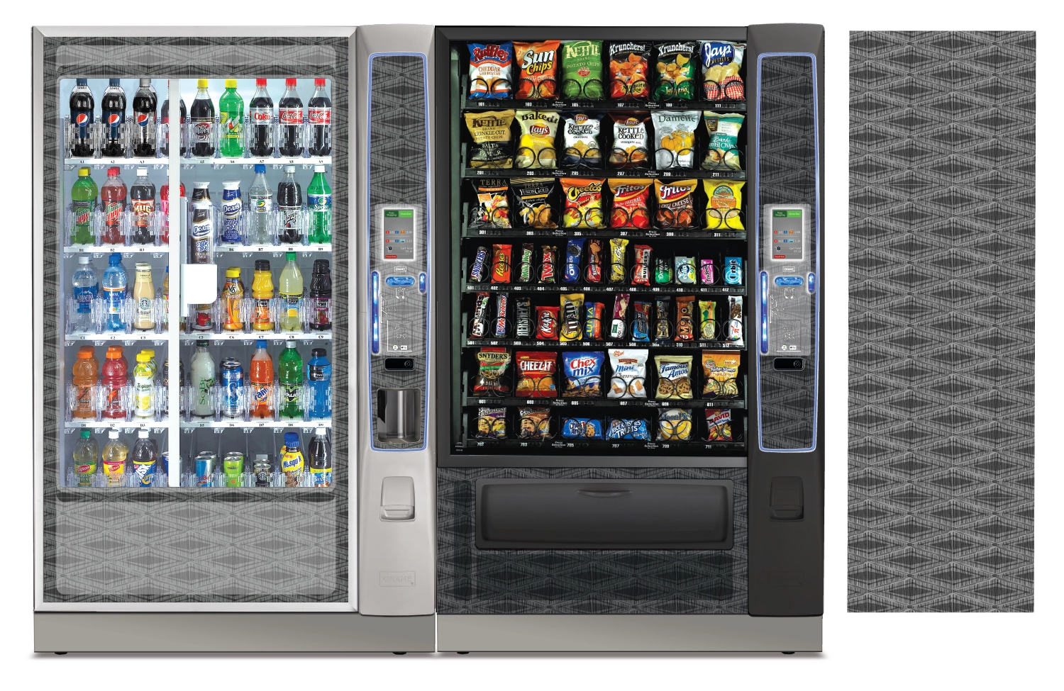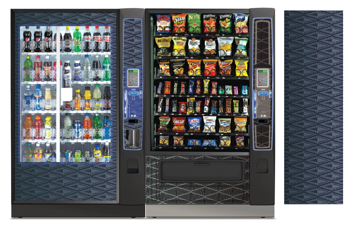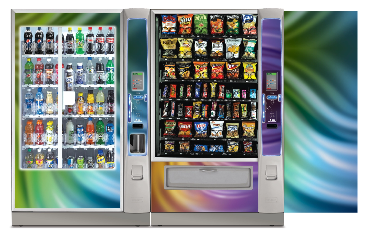 Create a collection of vending machine graphics that suit a spread of location environments and industries as options to choose from when graphics are not provided by the buyer. Implement color, saturation, textures, line, and tones to provide a diversity of visual solutions.