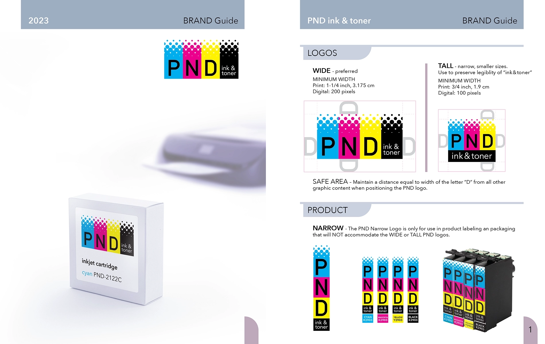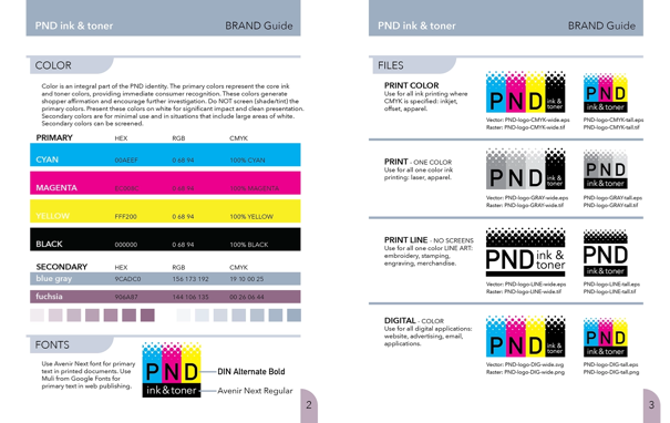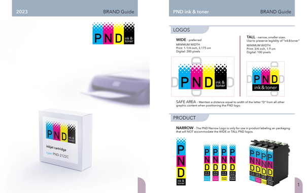 The ink and toner business runs deep and wide. These products display branding from large corporations to one-person garage shops. PND needed a logo that presented them as a credible business providing a reputable product with immediate recognition. The primary ink colors of cyan, magenta, yellow, and black guarantee association with inkjet cartridges and a spray dot pattern presents each color to reinforce the connection. The company name is printed above in black and white for maximum contrast. The logo clearly identifies the type of business and utilizes pure, saturated colors and high contrast to convey the qualities buyers seek in ink and toner. Brand guidelines support the logo through precise instructions for use, ensuring compliance and messaging consistency. The guide also includes secondary colors, logo files, graphic assets, presentation template designs, letterheads, business cards, digital signature, and creative direction to communicate brand culture. This branding solution gives PND a turn-key tool to launch and run its business confidently.