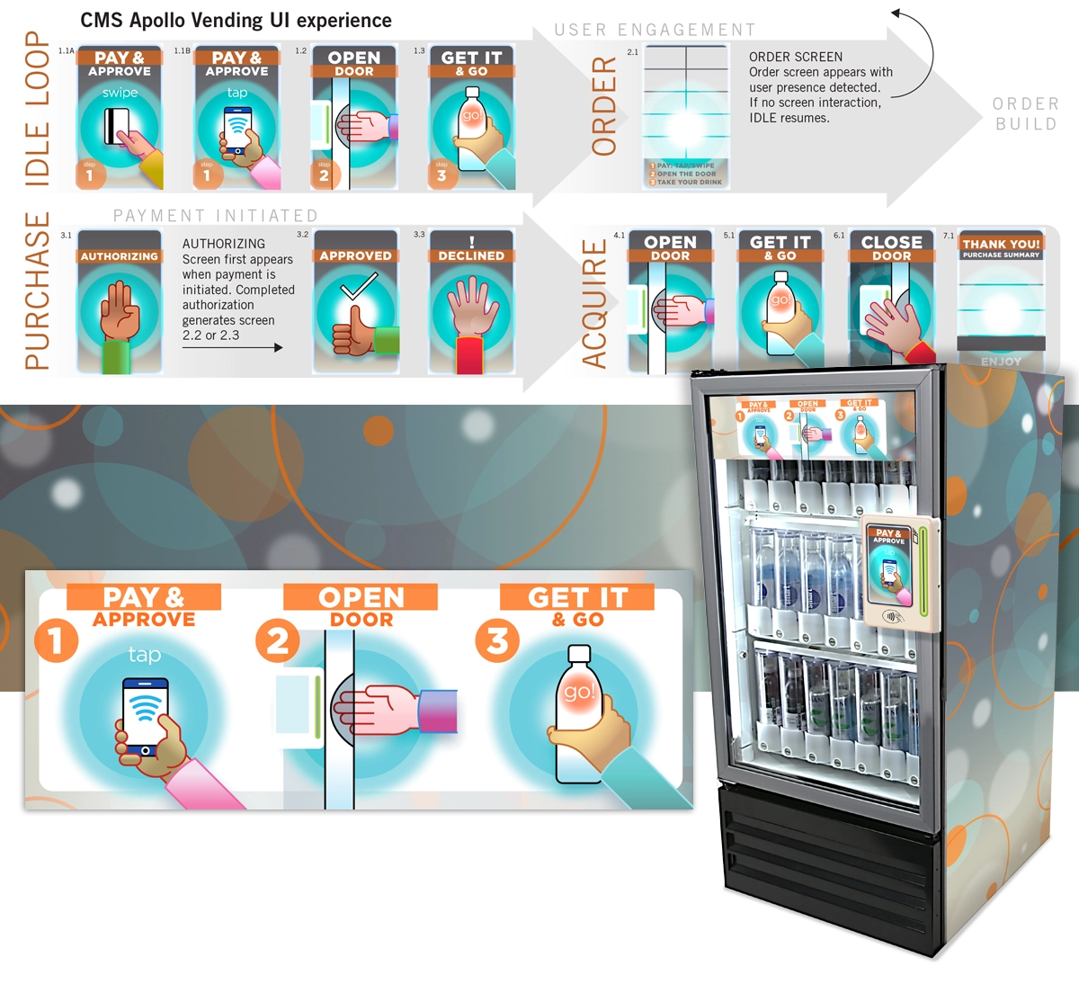 Crane Merchandising requested a complete user experience for their new Apollo Mini vending machine that identified the service provided and clearly demonstrated the purchasing process.