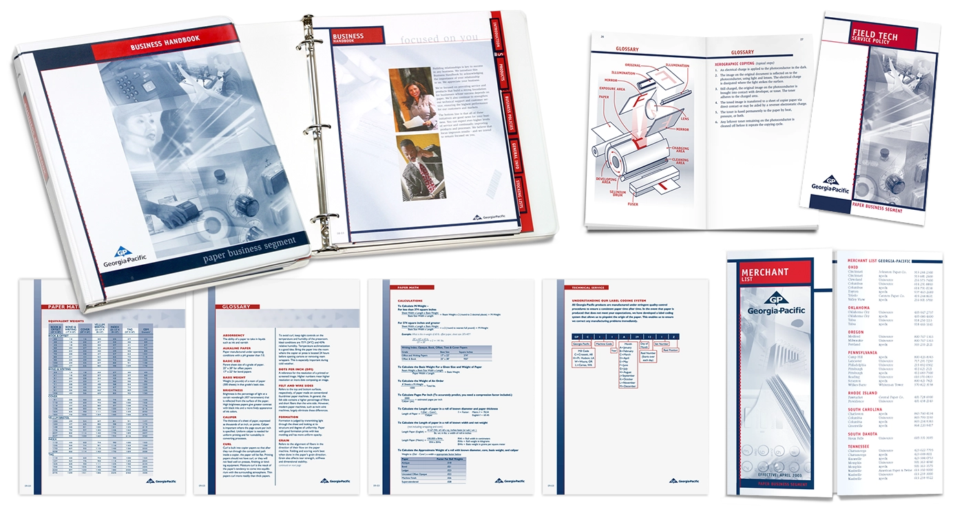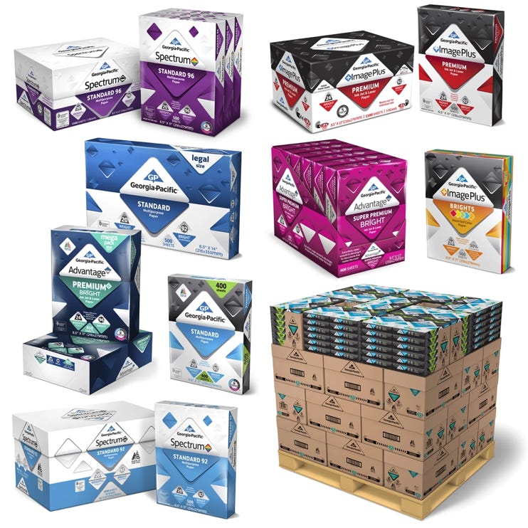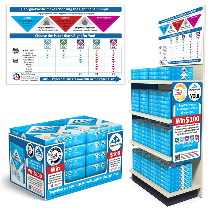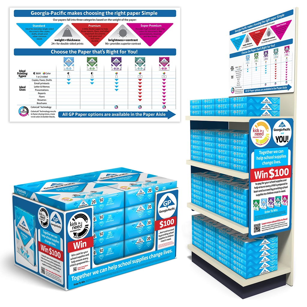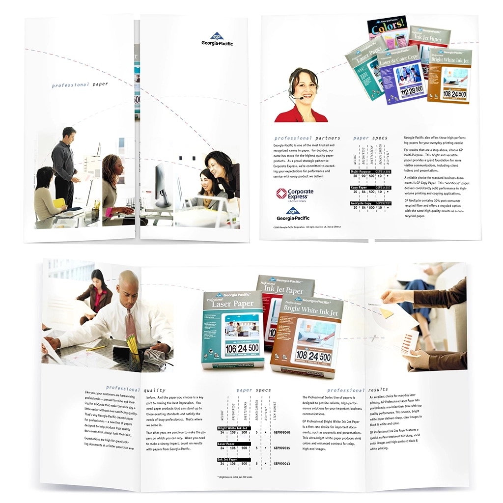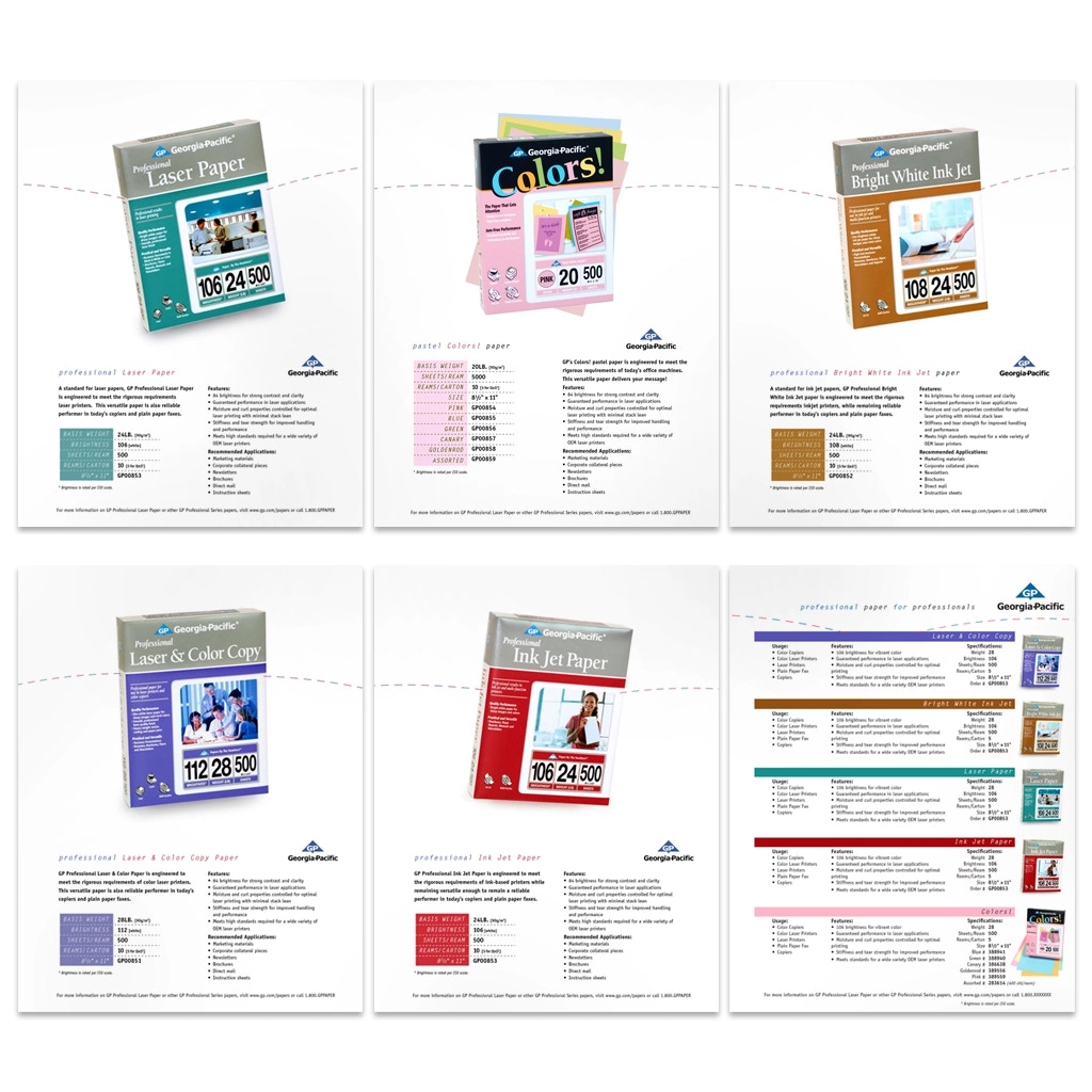 Design a Georgia-Pacific Office Papers tradeshow package that includes product photography, brochure, product sheets, and a tabletop display designed to portray the products as part of a productive and fun work environment. Create a brand-aligned marketing toolset for representatives and an engaging, informative environment for attendees. Build physical paper ream mockups, shoot product photography, and build a media asset library for marketing.