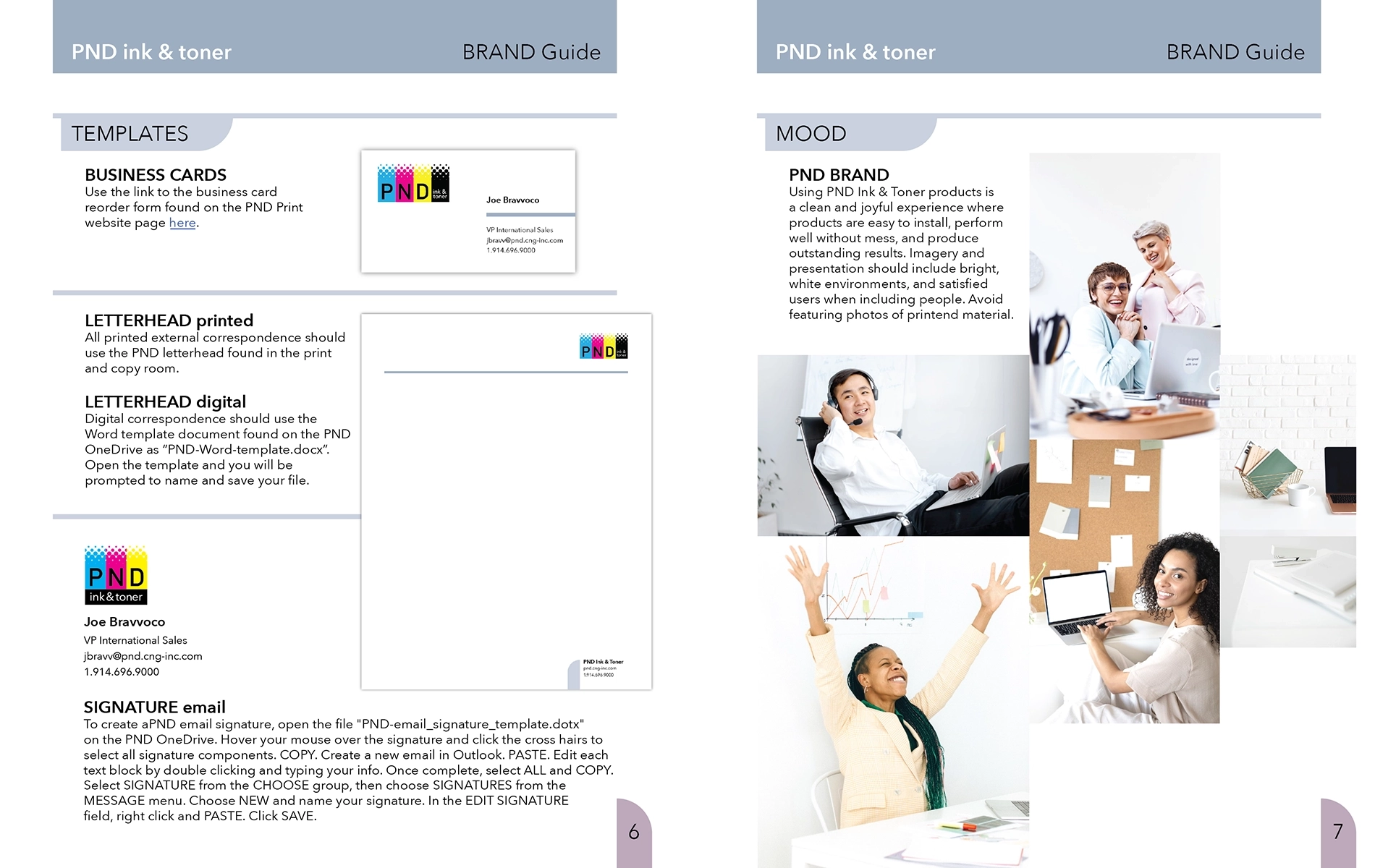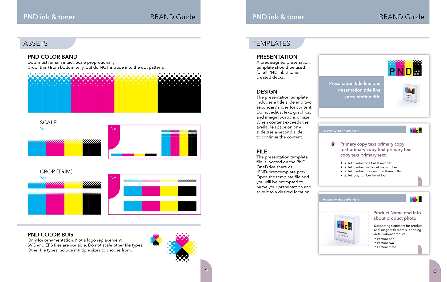 Develop a brand presenting PND Ink & Toner as a credible business providing a reputable product with immediate recognition—the primary ink colors of cyan, magenta, yellow, and black guarantee association and dot pattern provide immediate recognition with inkjet. The company name is printed on top in black and white for maximum contrast and logo clearly identifies the business type. Brand guidelines support the logo through precise instructions for use, ensuring compliance and messaging consistency.