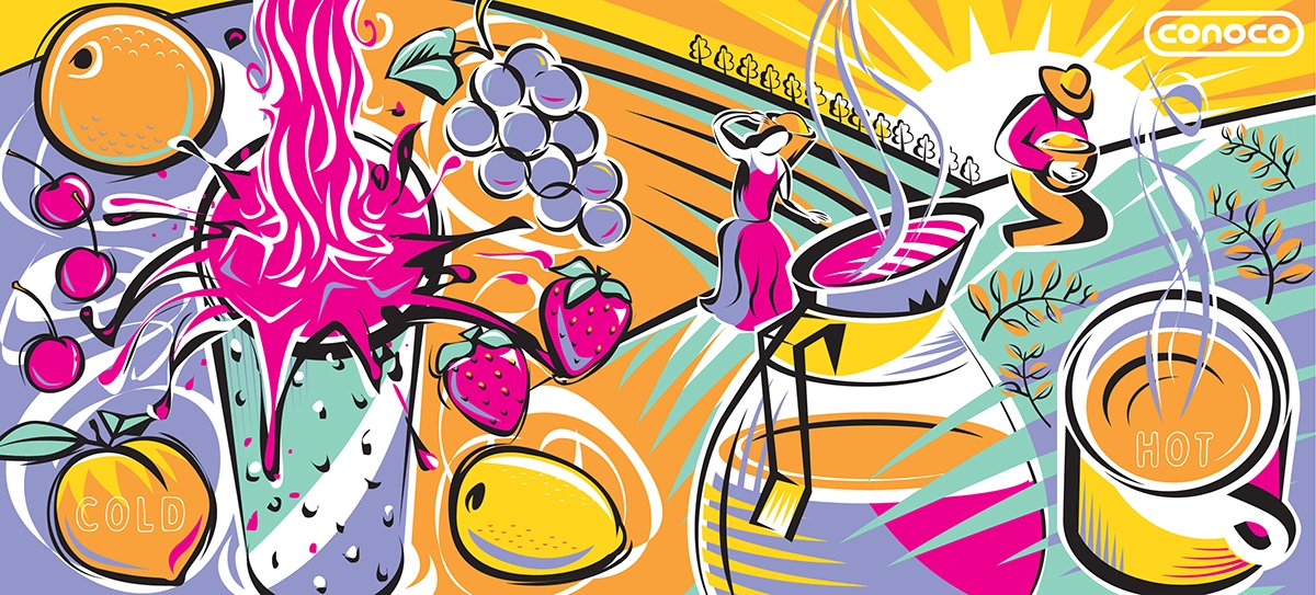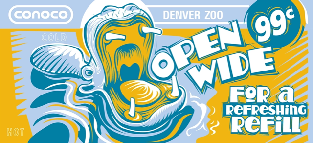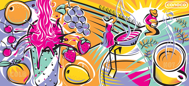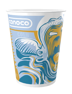 Craft a series of cup designs that promoted Conoco and collaboration with local entities.